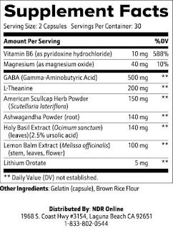 Every bottle contains vitamin B6 (10mg), magnesium (40mg), GABA (500mg), L-theanine (200mg), American skullcap herb powder (150mg), ashwagandha (140mg), holy basil extract (140mg), lemon balm extract (100mg), and lithium orotate (5mg).